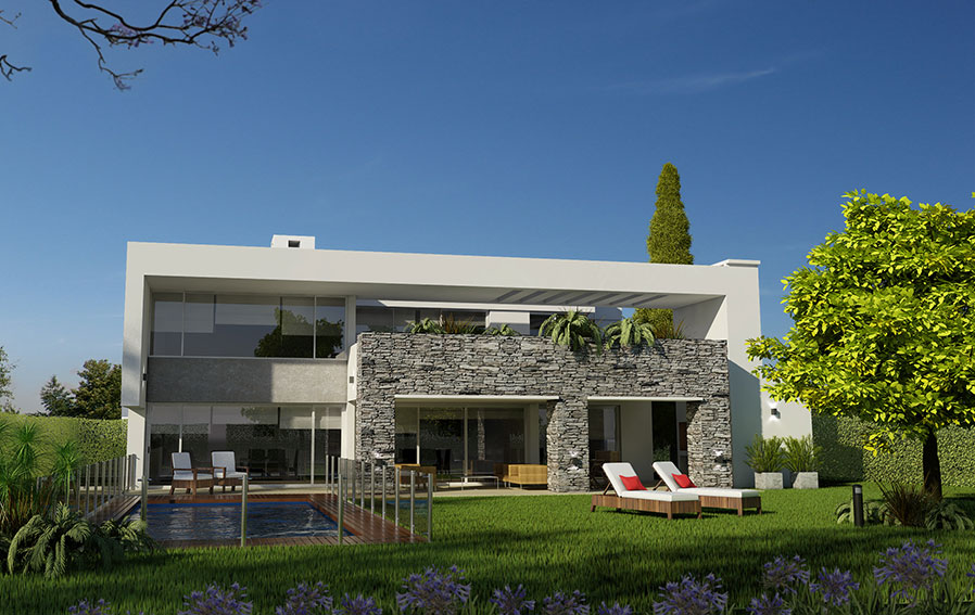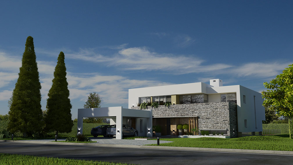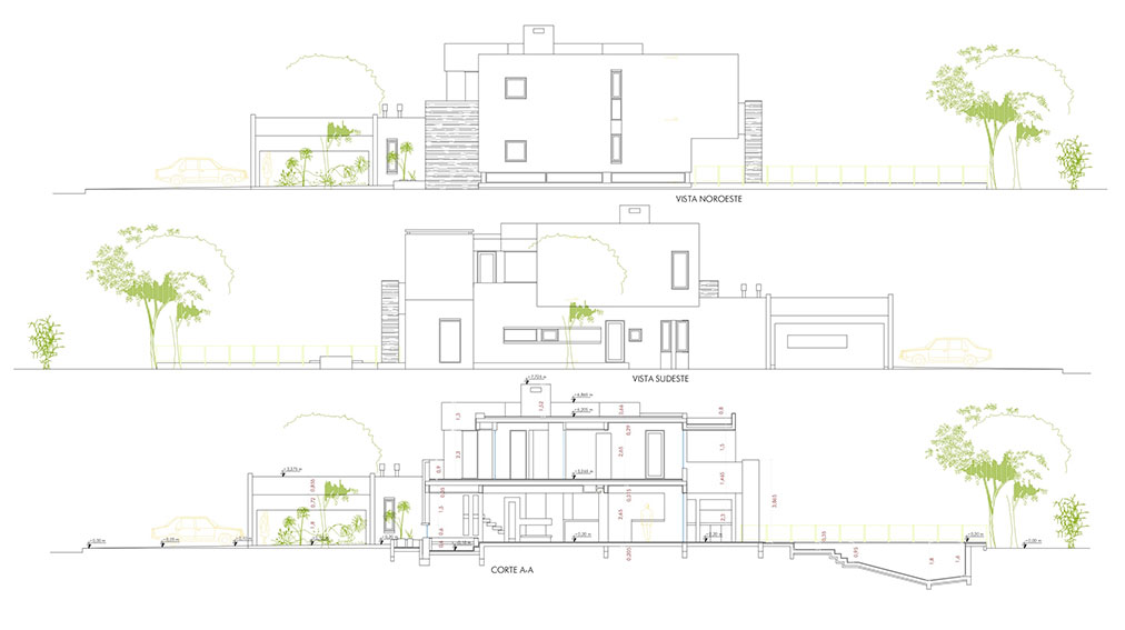 Haras 3 es un proyecto de vivienda unifamiliar ambicioso desarrollado a lo largo de varios años. Con un complejo programa inicial que incluia habitación para huéspedes, sala de cine, comedor para 12 personas, despensa, bar y estar de lectura entre otras cosas. Decidimos trabajar con una imagen fuerte y contundente con base tectónica, la idea de piedra en bruto surgida de las entranas de la tierra y sumamos el concepto de horizontalidad desarrollando líneas largas en fachadas que acusaran esa proyección de volúmenes pesados, importantes envolventes de la figura humana. Finalmente como decisión estratégica y en contraposición incorporamos una terraza jardín al conjunto como plataforma-mirador verde, como intersticio, vacio entre esas rocas artificiales, que contenga el corazón, , la mezcla de luz y aire y motive el encuentro y la contemplación de la distancia.