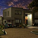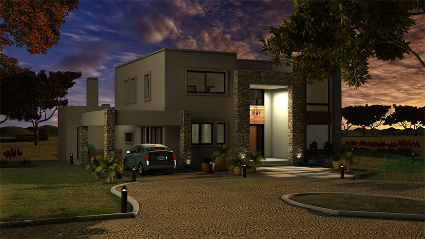 Hacia el frente el pórtico de piedra natural en doble altura da monumentalidad a la entrada enmarcando a la lámpara colgante que brilla con sello propio e introduce al visitante a un mundo más fantástico y acogedor. Es asi como este elemento da lógica y nombre a la casa: La casa de la lámpara.
