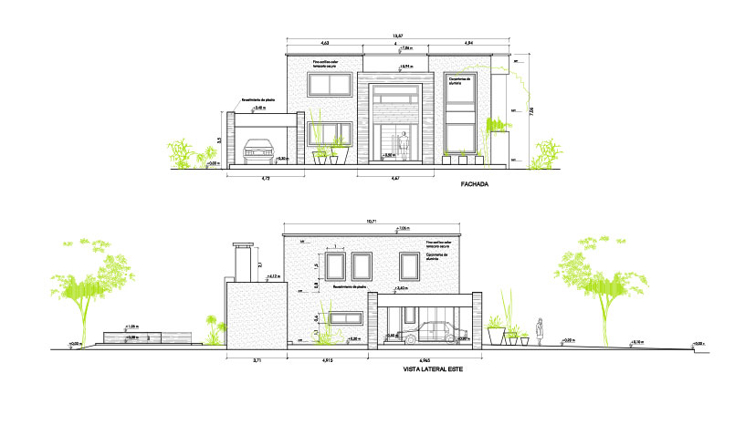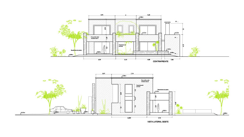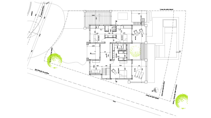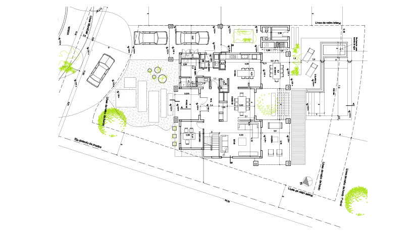 Confeccionamos esta casa como una continuidad de pensamiento proyectual de nuestra última muestra en el sector. Afinando la funcionalidad de la planta hacia un producto más compacto pero con la misma calidad de relación de lo social con el exterior, intensificando la actuación del patio del árbol como referencia central y de expansión hacia las vistas lejanas del golf situado a espaldas del loteo.