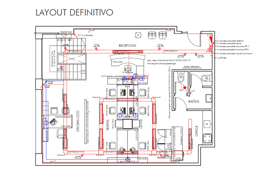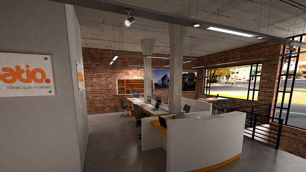 La particularidad de estas oficinas es la imagen industrial de la planta. Con paramentos de ladrillo macizo y estructura de Hormigón a la vista configuramos un conjunto ambivalente y en constante dialogo en contraposición. Escaleras de hierro y metal desplegado, instalaciones artísticas en vidrio laminado, bandejas eléctricas a la vista, Iluminacion difusa y puntal en alta gama de artefactos, piso de cemento alisado, muebles laqueados brillantes en color, ladrillo y hormigón, alta tecnología equipada, dan un resultado joven, transgresor, vanguardista, inteligente. Único. En fina sintonía con una empresa de servicios vinculada a la tecnología móvil, de diseño creativo y alto valor intelectual.