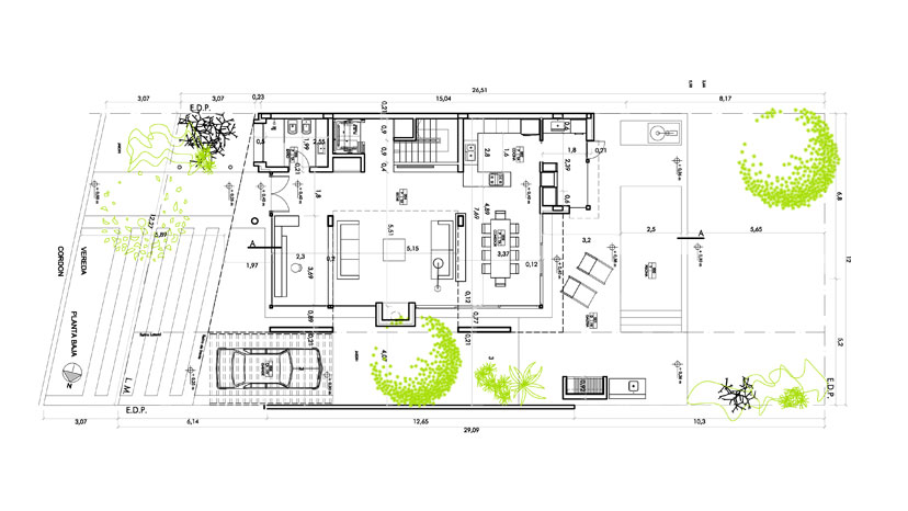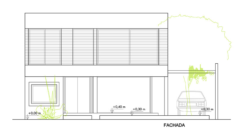 De nuevo nos encontramos por normas de código en el corto plazo con la misma tipología anterior, una casa recostada sobre una medianera y dejando libre la otra. En este caso, en un terreno de medidas mínimas, la solución estuvo centrada en maximizar ese retiro lateral agrandandolo al máximo para lograr que el espacio urbano se haga cargo de él dandole vida plena. Para eso se trabajó estirando la medida a una más acorde para la tarea y a su vez diseñando un cerramiento completamente vidriado hacia ese sector, que logre limitar el interior y el exterior con la mínima expresión incorporando los dos espacios y recuperando así el ancho total del terreno a nivel visual.
